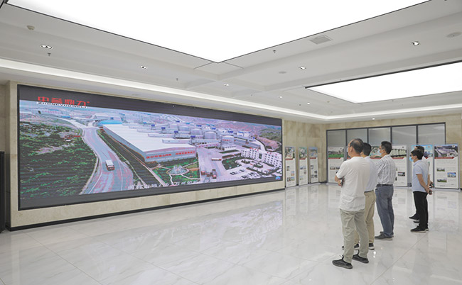考察團成員先來到河南中譽鼎力智能裝備有限公司,在智能化展示參觀了中譽鼎力五位一體循環(huán)建材產(chǎn)業(yè)園沙盤,并觀看了中譽鼎力宣傳片。