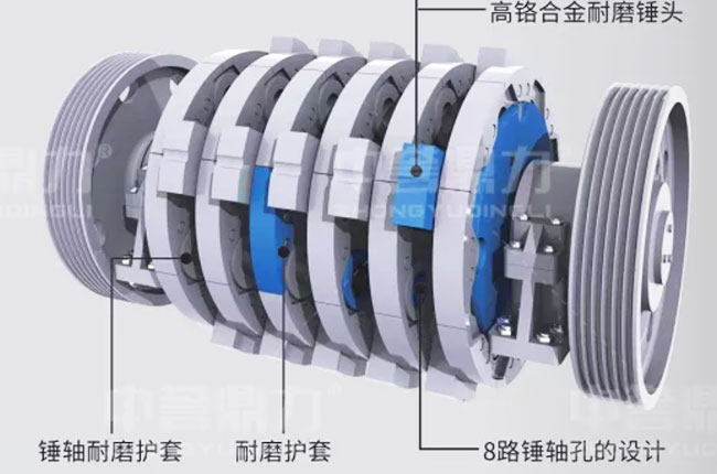 錘頭和轉子磨損大是傳統(tǒng)錘破的弊端之一,中譽鼎力新型錘式破碎機通過在轉子上增加護圈、錘軸增加護套等方式,保護轉子,延長轉子使用時間;