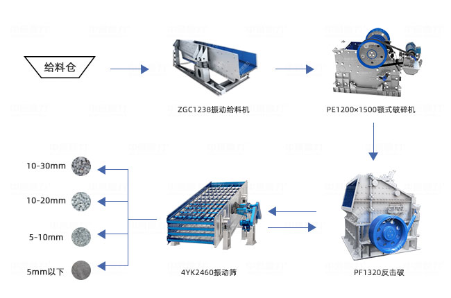 設(shè)備配置:原料倉(cāng),ZGC1238振動(dòng)給料機(jī)、PE1200×1500顎破機(jī)、CS430圓錐破、4YK2460振動(dòng)篩、輸送機(jī)。