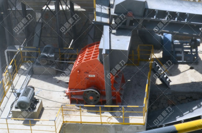 原料經(jīng)ZG2050振動給料機將物料送到一臺PCZ1820重型錘式破碎機進行破碎,破碎后的物料被輸送到一組2YKZ3070并篩進行篩分,篩分出米石和土石粉