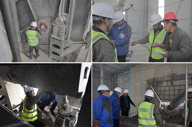 在現(xiàn)場,售后服務團隊各司其責,分別對這條時產1500噸砂石生產線的給料機、破碎機、制砂機、振動篩、減速機、輸送設備、散裝機、除塵設備、拉鏈機、電氣設備等進行細致檢查,并做詳細記錄。同時也向項目相關負責人就設備的日常使用保養(yǎng)、注意事項提出了建議。